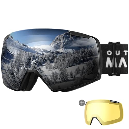 OutdoorMaster Heron skidglasögon med 2 linser, ramlösa, magnetiska utbytbara HD toric lins, OTG snowboardglasögon (BlackFrame Silver Vlt 10% + gul lins)