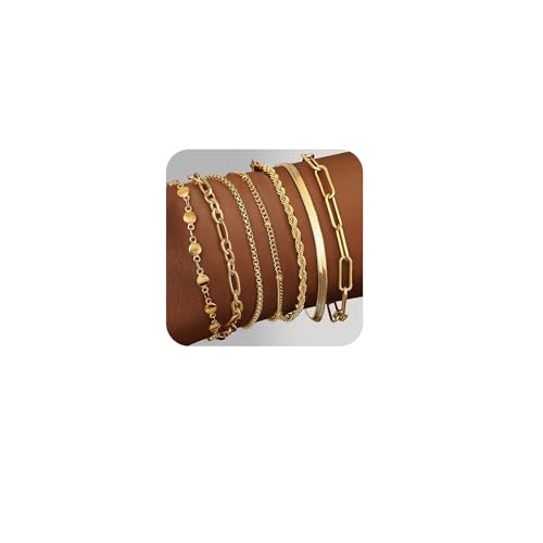 ADRAMATA 7 st kedjearmband för kvinnor, damer, 14K guldpläterade staplingsbara armband, tvinnad ormkedja, justerbar CZ-länk, berlockarmband, roséguld, silver, armbandsset, guld, Adjustable (6.3 to 8.2