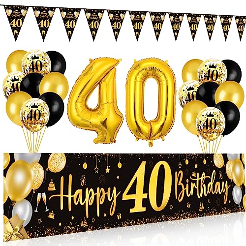 40 födelsedag dekoration man kvinna, 40 Happy Birthday-banderoll svart guld, ballonger 40 födelsedag vimpel girlang, dekoration 40. Födelsedag bakgrund ballonger svart guld för män kvinnor party