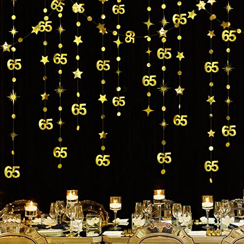Guld 65:e födelsedag dekorationer nummer 65 cirkel prick blinka stjärna girlang metallisk hängande streamer flaggväv banderoll bakgrund för 65 år gammal födelsedag glad 65-årsjubileum sex-fem