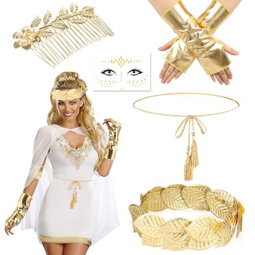 DPKOW Grekisk gudinna kostym för kvinnor, romerska blad Laurel krona grekiskt pannband hårkam guld tiara handskar bälte ansikte tatuering, kvinna flickor antika grekiska kostymtillbehör för grekiskt
