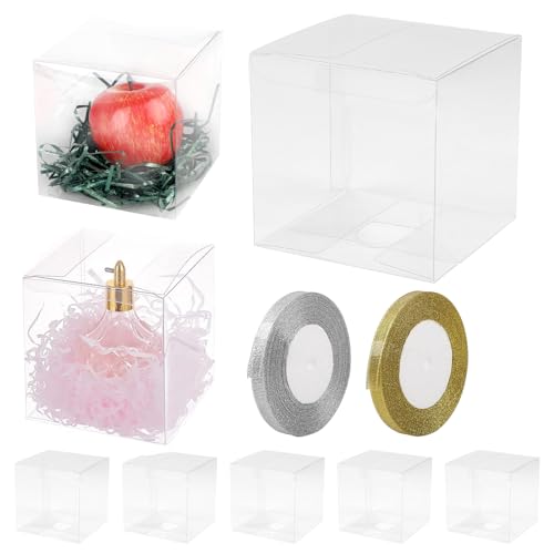 lalago Presentlådor i plast, 30 st genomskinliga presentlådor till jul, presentlådor för förpackning, bröllop, favör lådor, godis med 2 rullar guld- och silverband (12 x 12 x 12 cm)