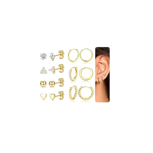 FIOROYAL 11 Par 14K guld örhängen Guld Small Hoop Örhängen Set Ball Cubic Zirconia Hypoallergena Kirurgiska stålörhängen Platt rygg Brosk Sleeper Örhängen för kvinnor