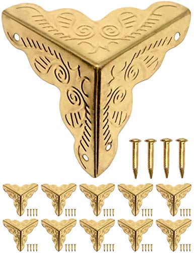 FUXXER – 10 x antika möbelhörn, skyddande hörn, hörnskydd, kantskydd, beslag för lådor, möbler, hylla, bord, gyllene guld mässingslook, inkluderar spikar, set med 10