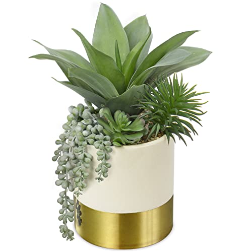 Hollyone 30 cm konstgjorda suckulenter, 12 tum falsk maguey med suckulenter i guld keramisk kruka, dekorativ fuskväxt i kruka inomhus för heminredning, vardagsrum, hylla, bord, skrivbord,