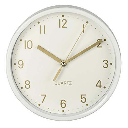 Hama Analog väggklocka inklusive batteri (tyst klocka utan tickande, batteridriven bordsklocka med stativ och krypande sekundvisare, för upphängning och ställning, 16 cm rund) vit, guld