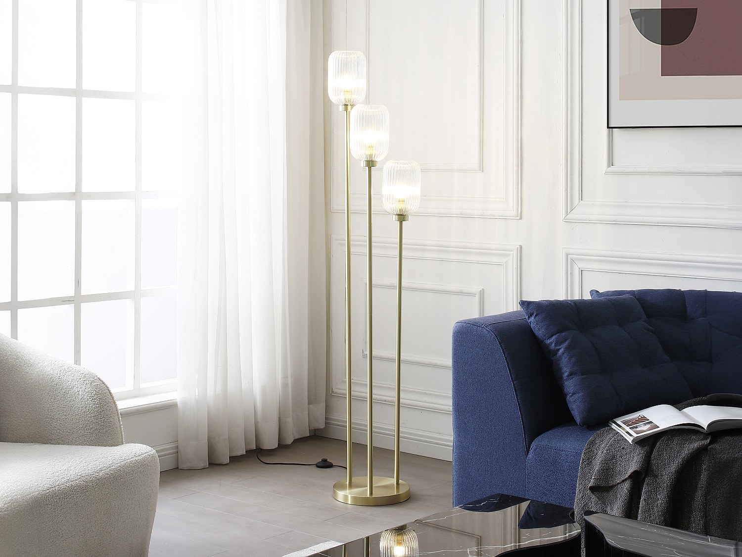 Guldfärgad golvlampa med 3 justerbara skärmar och LED-lampor