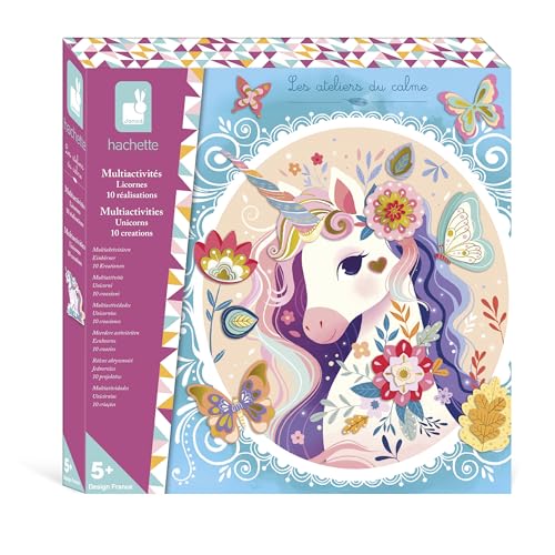 Janod - Kreativ enhörning med flera aktiviteter - 13 aktiviteter att dekorera - mosaik, glänsande klistermärken och guldpapper - från 6 år
