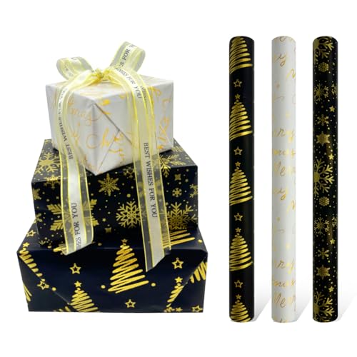 Presentinslagningspapper rulle till jul: Omslagspapper 3 designer 43 cm x 3 m tryckt med guldpulver snöflinga julgran för presentförpackning