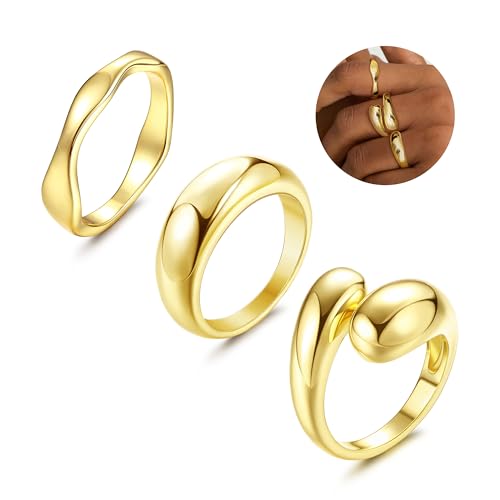 Dochais 3 st guldringar set, 14K guldpläterad ringuppsättning, stapelbar ring guld för kvinnor män, öppen statementring, justerbar tumrosa ring, tjocka ringar som gåva, bekväm passform storlek 6 till