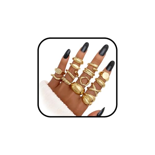 TELAIN Ringar set damer guld, 15 knogringar i olika stilar, justerbara guldringar, perfekt som smyckesgåva till födelsedag, alla hjärtans dag, jul, X-Large, Plast