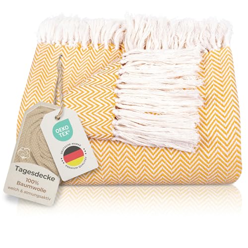 Gräfenstayn Premium överkast med fransar – 100 % bomull – 150 x 200 cm – fiskbensmönster sommarfilt – bomullsfilt som sängskydd, sofföverkast, soffskydd (gul)