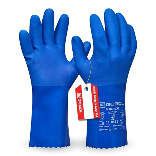 Gebol Blue Tech | Långa gummihandskar av PVC med bomullsstickning mot kemikalier, syra, olja och fett | vattentäta arbetshandskar för rengöring | män | storlek XL (storlek 10) | blå | 1 par