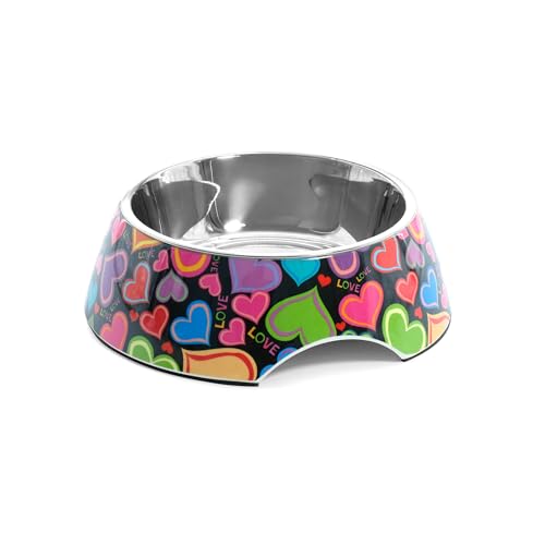 Record Lovely Bowl för hundar och katter – rostfritt stål och melamin – utrustad med halkfria gummikuddar – Mått: Diameter 17,5 cm – kapacitet 350 ml – flerfärgad hjärtdesign