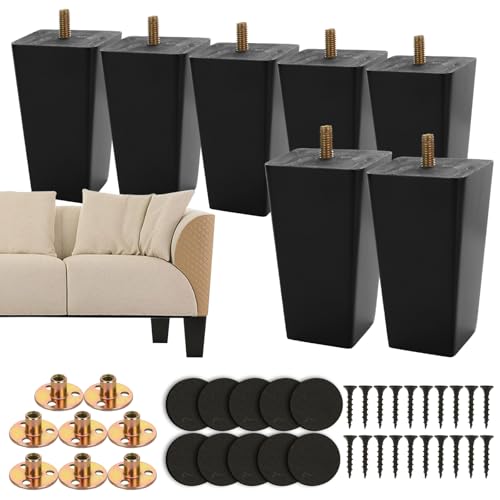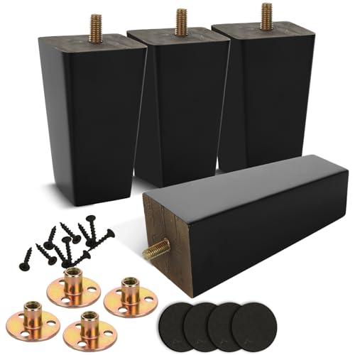LOPYXBR 4 stycken möbelfötter i trä, 15 cm, möbelfötter, svarta möbelben, träfötter med förborrade M8-bult, monteringsplattor, gummikuddar och skruvar för soffa, säng, skåp, soffa, ottoman
