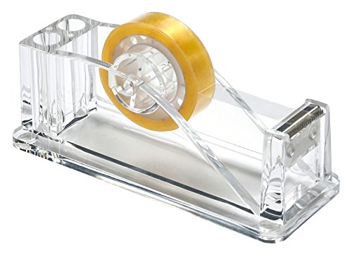 OSCO Klar akrylbandhållare med tejp | skrivbordstejp dispenser | 2 fack för pennor eller pennor | genomskinliga gummikuddar halkfria | H 6,4 x B 13 x D 12,7 cm |