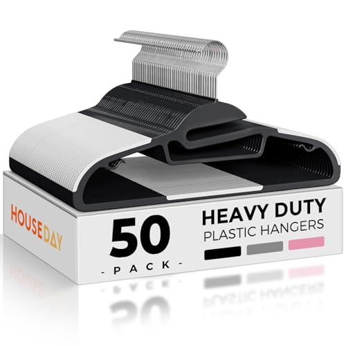 HOUSE DAY Svarta plastgalgar, 50-pack, smala och platsbesparande, halkfria galgar med gummikuddar, robusta klädhängare för garderoben, S-formade klädhängare för skjortor, kostymer, byxor och kjolar.