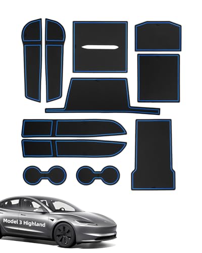 LANGBEAN Halkskyddsmattor för Tesla Model 3 Highland 2024 2025, 11 Delar Gummimattor för Mittkonsol, Förvaringsfack, Mugghållare, Integrerat Dörrfack, Armstödslåda, Svart & Blå