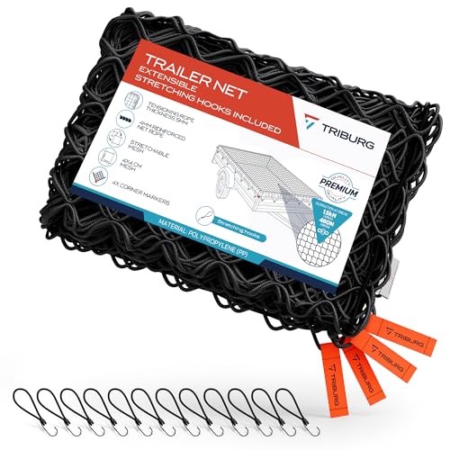 TRIBURG släpvagnsnät Töjbart 2x3 m till 3x4 m inkl. 12 expanderkrokar - Elastiskt släpvagnsnät med hörnmarkeringar och gummirep