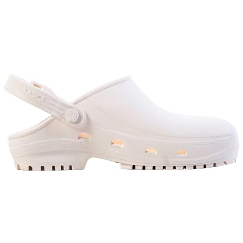 REPOSA Eco - bekväma gummiskor för kvinnor och män, lätta, stötfria, perfekta för hem, trädgård, gör-det-själv - anatomiska sandaler med sidohål, vikbar sladd, Vitt och blått, 42 EU