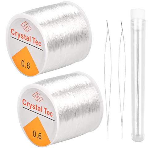 KYSUN 2 stycken 100 m elastisk smyckestråd, kristall elastiskt snöre, kristallpärlsnöre, transparent gummitråd med 2 stycken pärlor nål för armband smycken hantverk, 0,6 mm