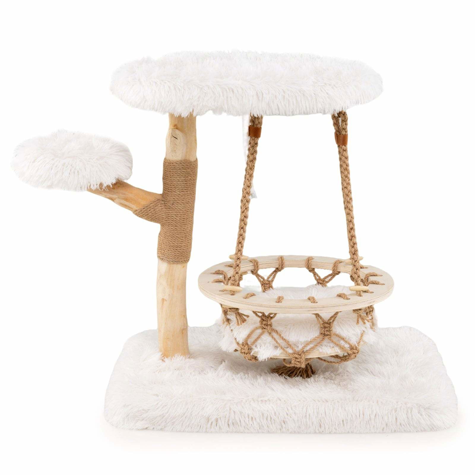 Klösträd i trä med gunga, sisalstolpe – 4 nivåer, plyschplattformar