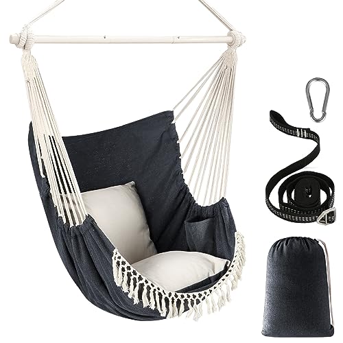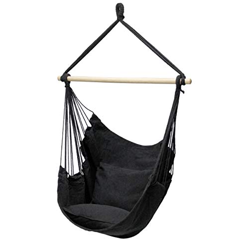ECD Germany Hängande stol med 2 kuddar - Bomull - Tvärstång i hårdträ - Belastningsbar upp till 120 kg - Antracit - Inomhus/utomhus - stol Hängande gunga Hängmatta Hängande korg Gungande stolssäte