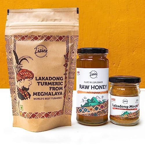 QURA Megha Special Combo| 150 g Lakadong gurkmeja pulver, 300 g vildblomma honung och 50 g Lakadong Mirch