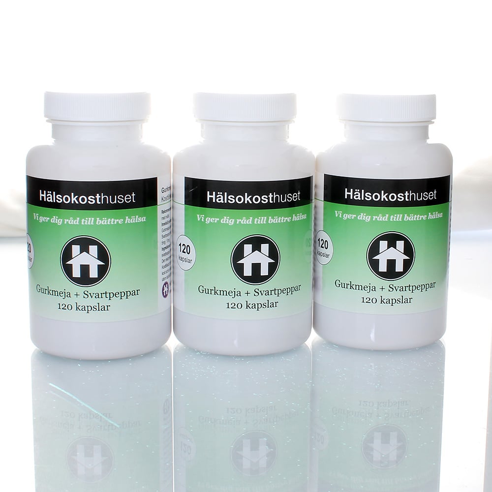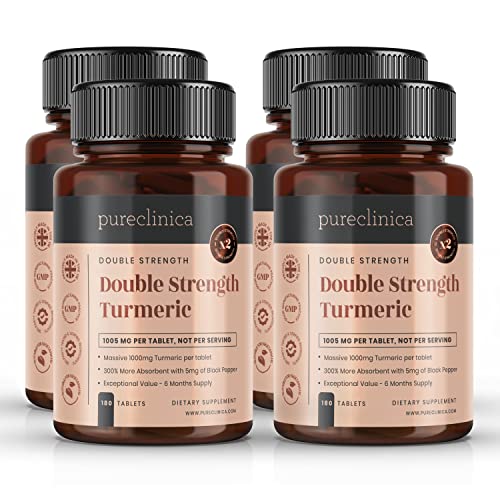 Dubbel stark gurkmeja – 1 000 mg x 720 tabletter (4 flaskor om 180) – naturliga nivåer av kurkumin – och 5 mg svartpeppar extrakt.