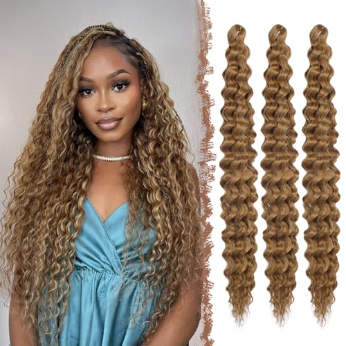 FESHFEN Ocean Wave Virkat Hårförlängningar - 3 Stycken Vågiga Boho Virkade Flätor Vågigt Gyllenbrun Hår Virka Flätning Förlängning Syntetisk Hårförlängning Hårstycke för Kvinnor, 55 cm