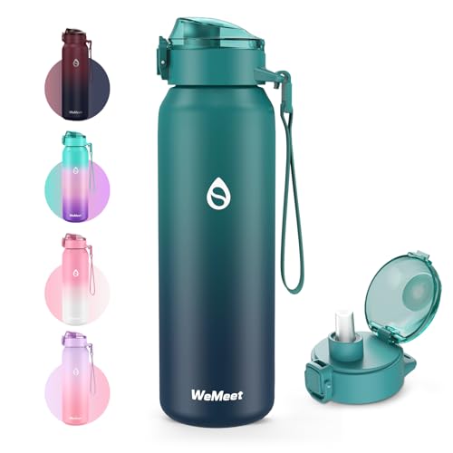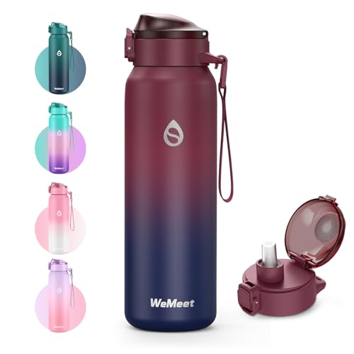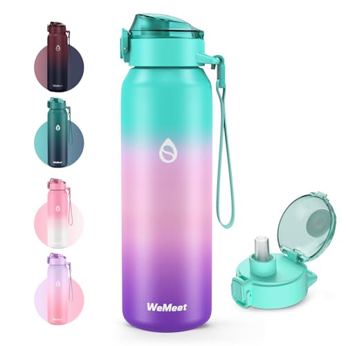 WEMEET Vattenflaska med avtagbart sugrör och tugglock 32 oz, 18/10 rostfritt stål metallflaska håller kylan 48 h varm 24 timmar för sport, gym, resor och skola (grön rosa lila)