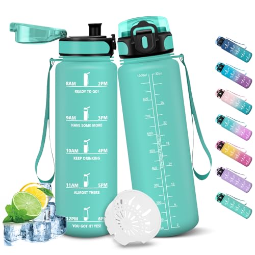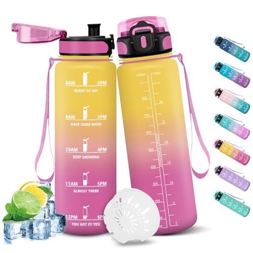 HoneyHolly Vattenflaska 1 000 ml med tidsmarkörer, motiverande flaska, läckagesäker, sportflaska, gym, vattenflaska, vattenflaska, för skola, camping, yoga, kontor