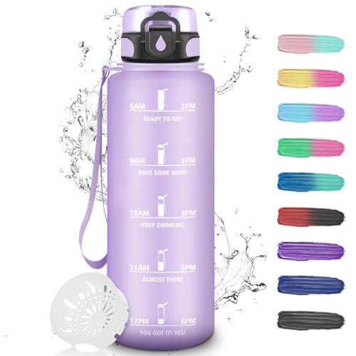 Vattenflaska 1,5 liters flaska med filter, läckagefri cykelflaska, vandringsflaska, lätt att bära, vattenflaska med drickstider, för sport, gym, vandring, utomhus, lila
