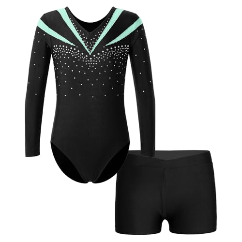 Oyolan Barn flicka trikåer gymnastik strass glänsande långärmad med shorts gym set dans skridskoåkning prestanda 5-16 år, ljusgrön, 9-10 �r