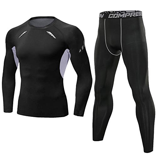 Sykooria Termiskt underkläder för herr kompressions-T-shirt långärmad + löpning fitness gym leggings byxor, Färg: grå, XL