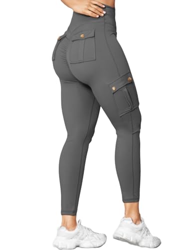 Nuofengkudu Dam scrunchs rumpa cargo leggings gym med fickor ankellängd hög midja rumpa magkontroll solid löpning sport joggingbyxor, Mörkgrått, S