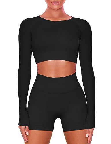 Buttergene träningsset för kvinnor, 2 delar, långärmade yogakläder, gymkläder, sömlös, ribbad magtröja, hög midja leggings, 1top+shorts-svart, S