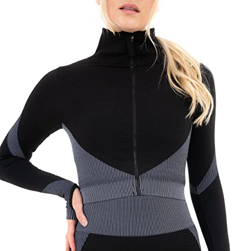 M17 Dam långärmad gymkläder sportkläder, kvinnor sport dragkedja elastisk randig jacka med tumhål, perfekt outfit för träning, Svart/grå, XL
