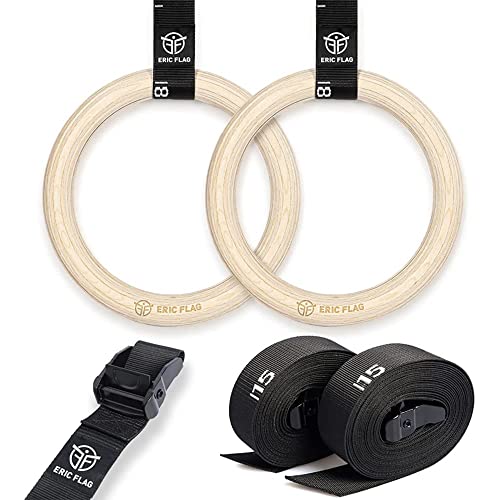 Eric Flag Gymnastikringar i trä - Gymringar med Olympiska Dimensioner, Diameter 28 mm - Träringar med Graderade Upphängningsremmar, Ringar Justerbara för Fitness, Gymnastik, Styrketräning och Crossfit