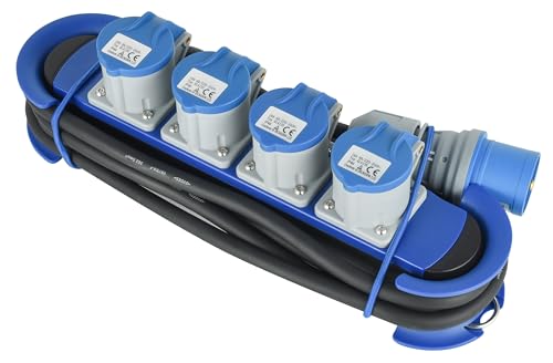 Electraline 62582 Utomhus campinggrenuttag med CEE-kontakt, 4 CEE-uttag 16A (2P+T) IP44, hängande med 2 krokar + elastiska buntband, kabel H07RN-F 3G2.5 3M lämplig för camping, husvagn