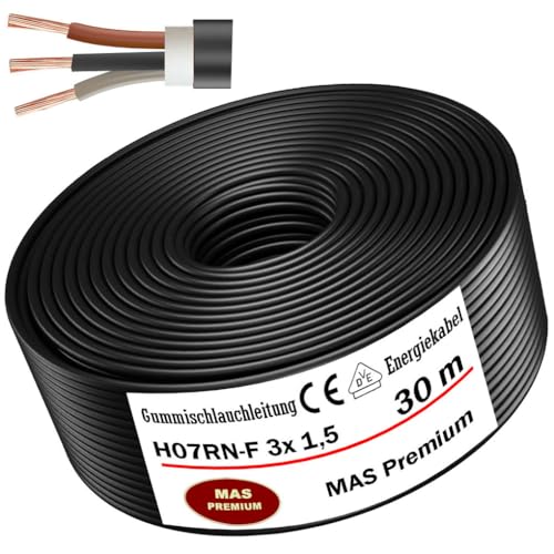 MAS Premium 5–100 m gummislangkabel, strömkabel, byggarbetsplatskabel, H07RN-F 3G 1, 3G 1,5, 3G 2,5, 3G 4, 3G 6, 3G 10 eller 3x 1,5 flexibel kabel för tung utrustning (H07RN-F 3 x 1,5 mm², 30 m)