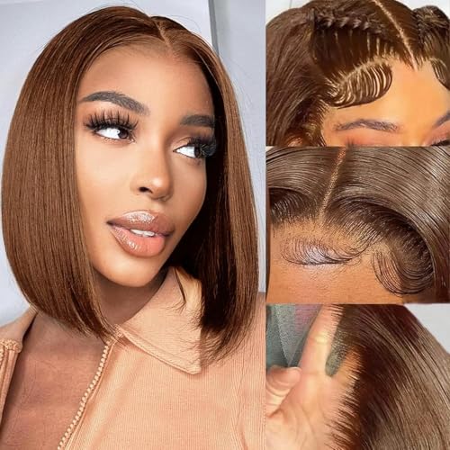 Lace Front Bob Wig Human Hair 13X4 Lace Front Wig Bob Lace Wig Brazilian Virgin Wig Human Hair 150% Density Short Straight Bob Wigs Naturlig HD Transparent chokladbrun färg 12 Inch