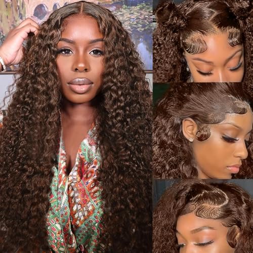 Rebasar 13x4 Lace Front Wig Human Hair Deep Wave Brazilian Human Hair Brune 150% Density Pre Plucked With Baby Hair Natural Hairline Curly Lace Wig Chocolate Brown Color 18 Inch