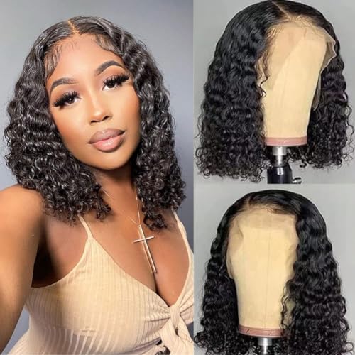 Human Hair Wig 13×4 Lace Wig Deep Wave Curly Short Bob Lace Front Wig Human Hair Wigs Brazilian Virgin Hair 150% Density Natural Colour 12 Inches(30cm)