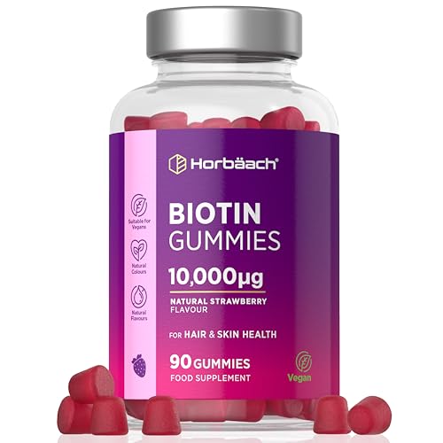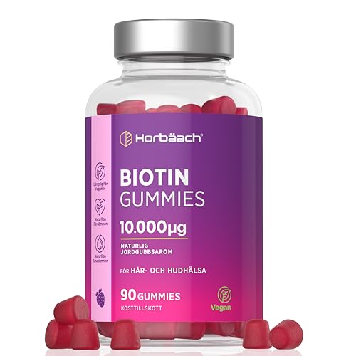 Biotin Gummies | 10000 mcg | 90 Veganska Gummies med Jordgubbssmak | Vitamin för Hår hud och naglar | Kosttillskott Män & Kvinnor | Biotin for Hair Women | Horbaach
