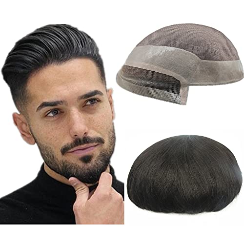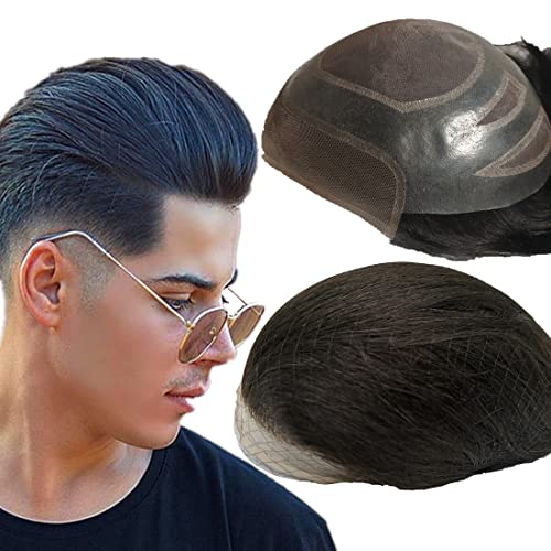 NLW Män Toupee - Human Hair Lace med Mono Round Hair Replacement System för Män (#1B 9 * 7)