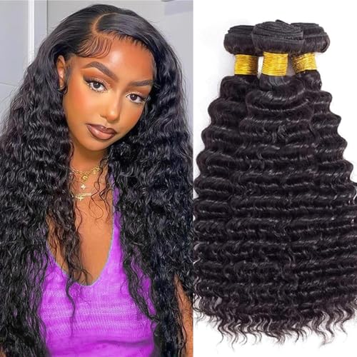 Deep Wave Human Hair Bundles 16 18 20 Inch Curly Human Hair Extension for Women 100% Unprocessed Brazilian Virgin Human Hair 3 Bundles Human Hair Natural Black Color