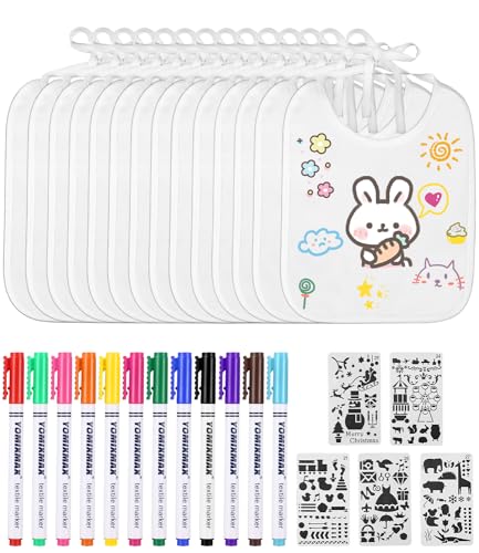 Faburo 12 stycken babyhaklappar att måla, 20 x 24 cm baby haklapp av bomull dubbelsidig med 14 st färgad textilpenna 5 st målningsmallar för babyshower party