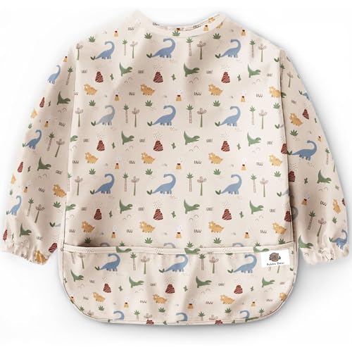 Bubba Bear Haklapp för baby med ärmar – tvättbar haklapp med ärmar, babyhaklapp för babymat, helkroppshaklapp för baby, ärmhaklappar för baby, barnmat, Beige dinosaurie, 6-24 Monate