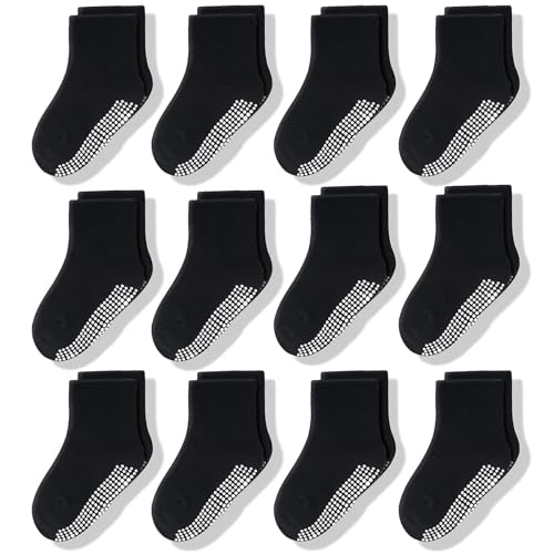CozyWay Baby & Småbarn strumpor med grepp Halkfria Crew Grip Strumpor för flickor och pojkar Mjuk Bekväm Bomull 3T-5T Svart 12-pack